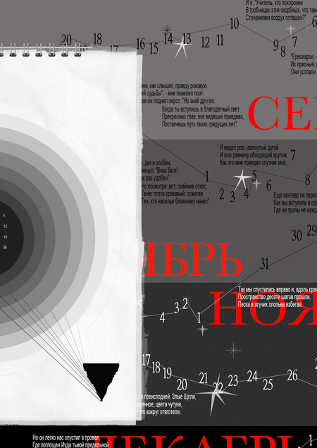 Календарь-карта. По мере прохождения открывается новый уровень путешествия. Звездочки обозначают выходные дни, а линии пути совпадают с тем, как строится стих Данте. На календаре можно найти цитаты из «Божественной комедии».
