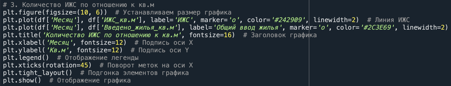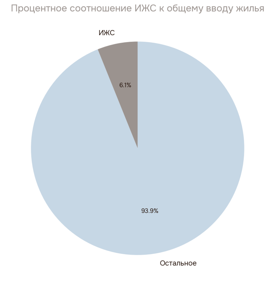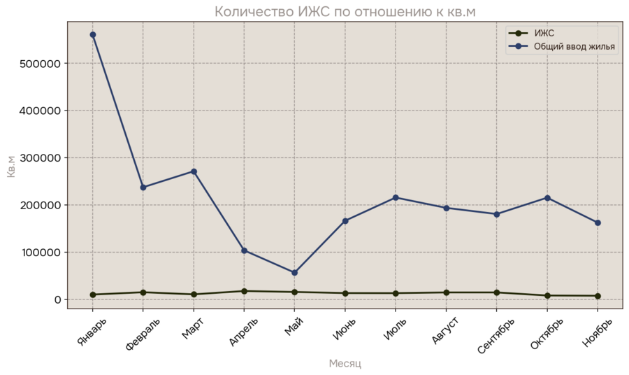 Интересно выглядит график отношения ИЖС к Новостройкам. У частных домов все стабильно, нет взлетов — нет падений, в отличие от новостроек, что очень хорошо видно на графике. Ну а количество кв метров у частных домов сильно отстает от новых многоквартирных домов.