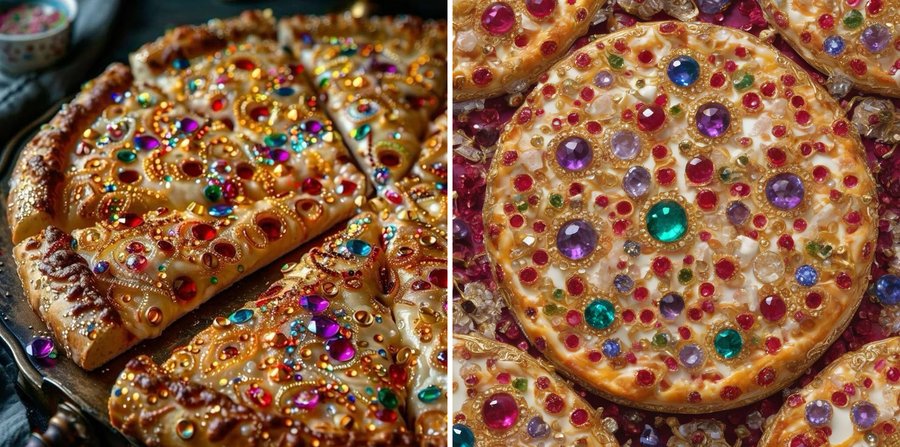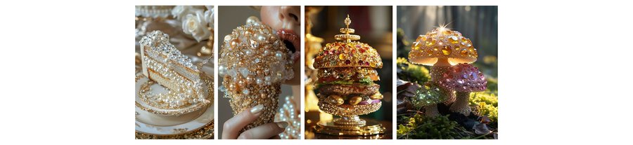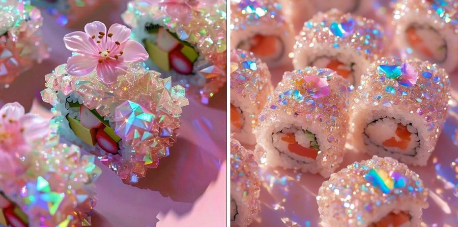 В центре внимания — еда, представленная в изысканной, почти ювелирной форме. Каждое блюдо в серии украшено элементами, напоминающими драгоценные камни, кристаллы и блеск, что создаёт ощущение роскоши и утончённости.