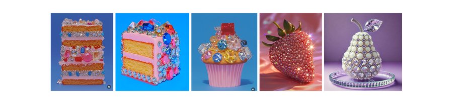 В качестве примера: «photo in CRISTAL style, a jeweled strawberry covered in sparkling pink crystals, macro shot, on pink silk, glamorous lighting, bling effect, intricate details, soft background»