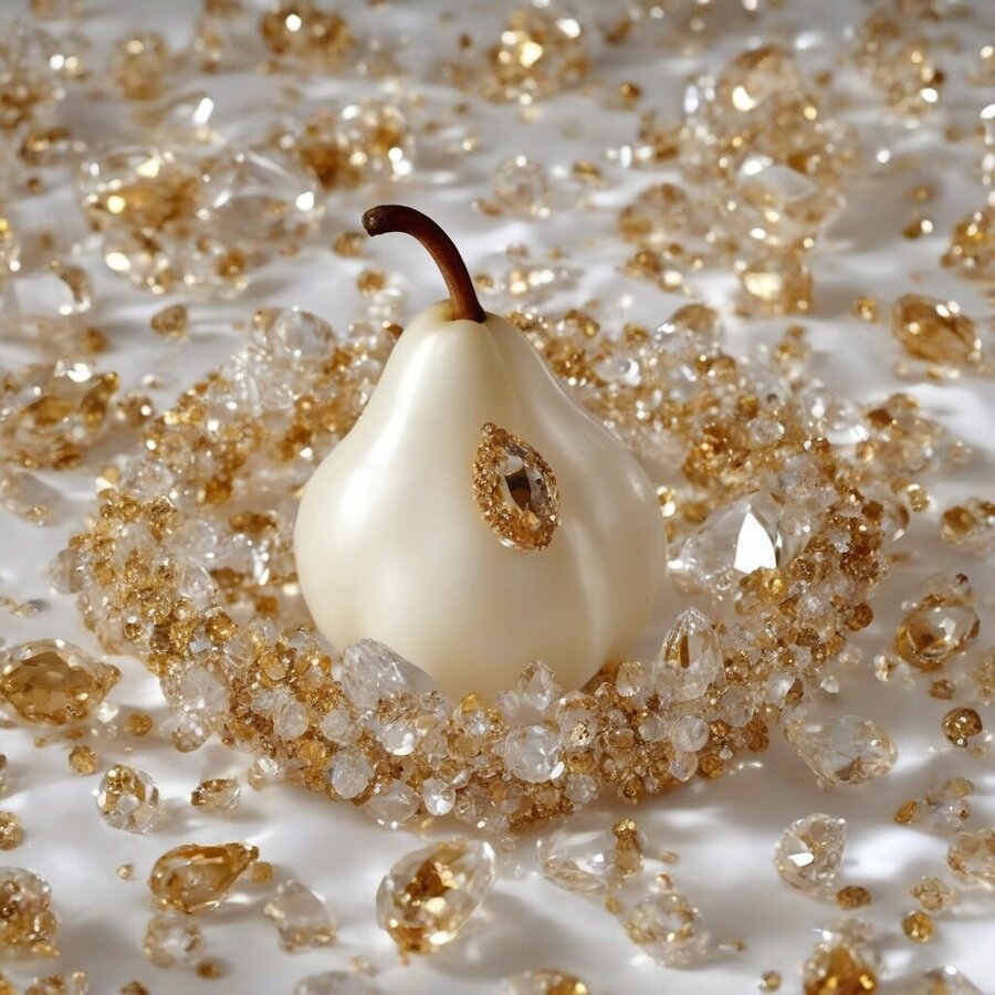 prompt = «photo in CRISTAL style, white pear, golden crystals»