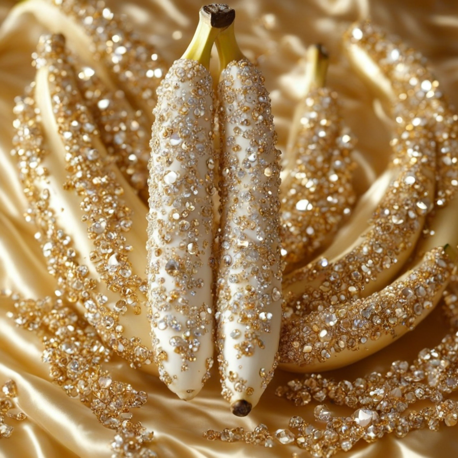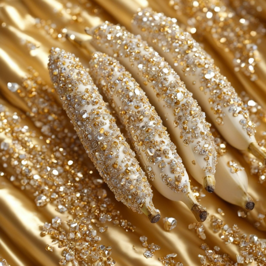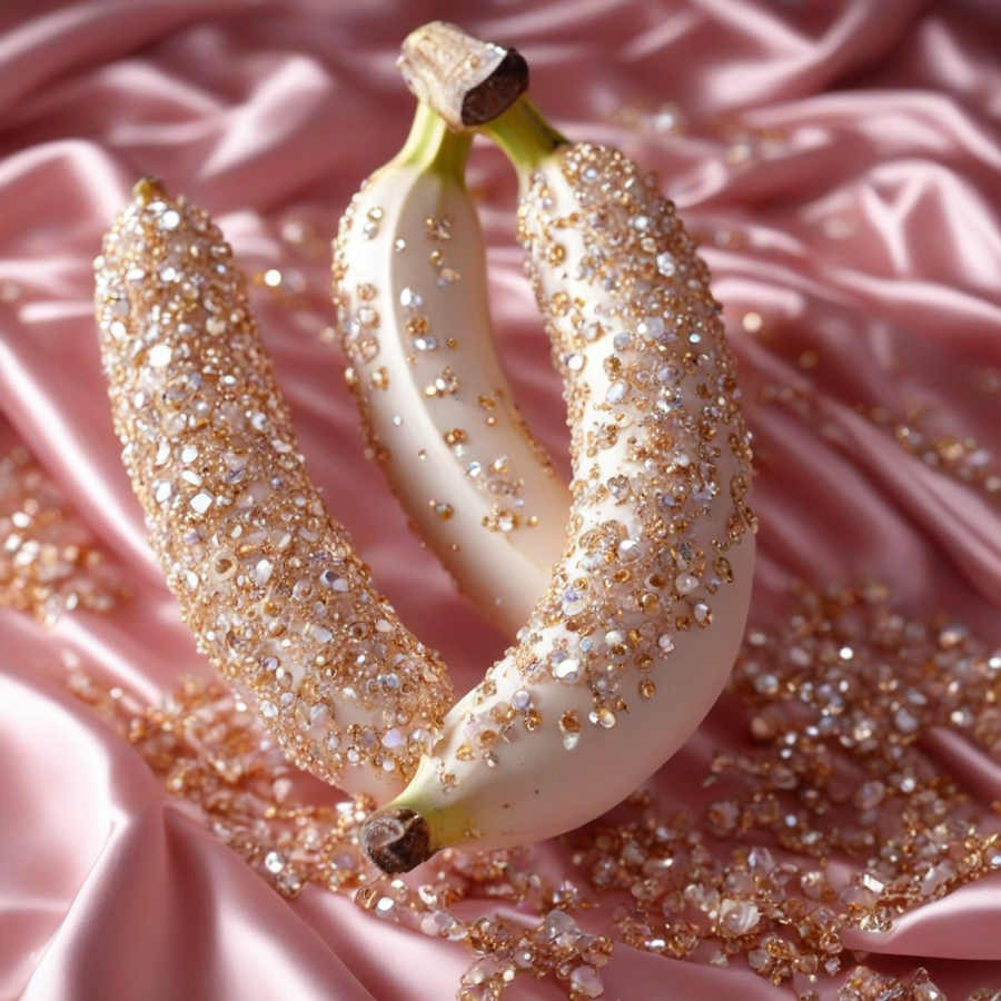 prompt = «photo in CRISTAL style, white banana covered with sparkling gold crystals…»