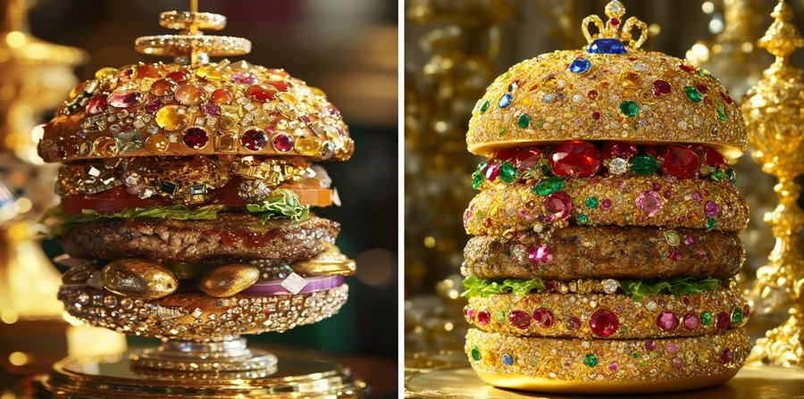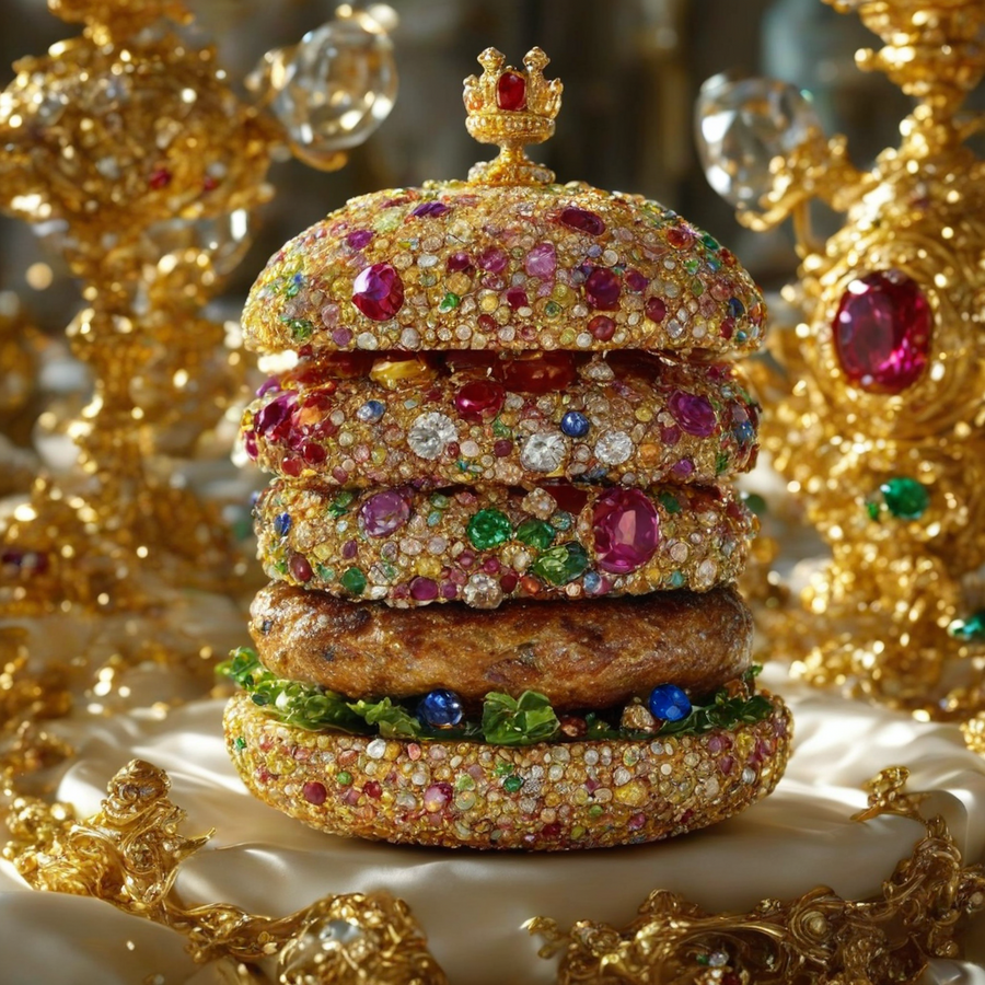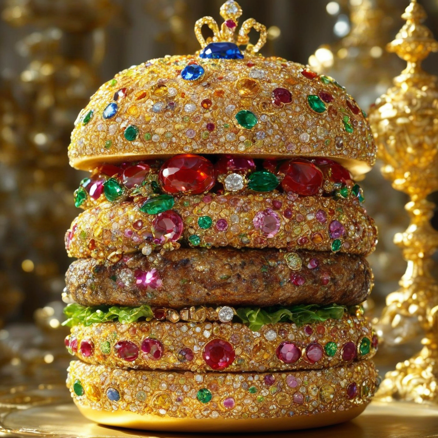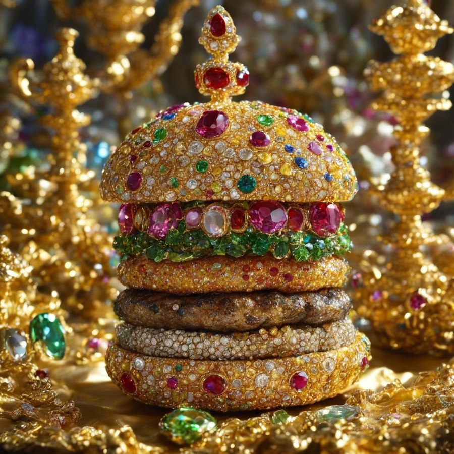 prompt = «photo in CRISTAL style, luxurious, hyper-realistic hamburger......»