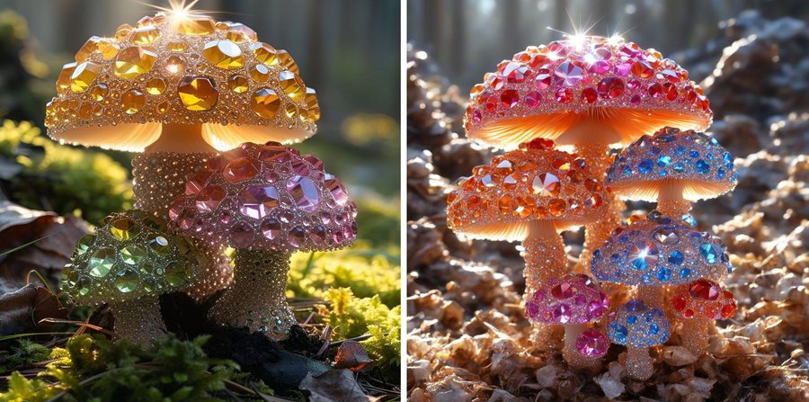 prompt = «photo in CRISTAL style, a colored mushroom with many crystals on it»