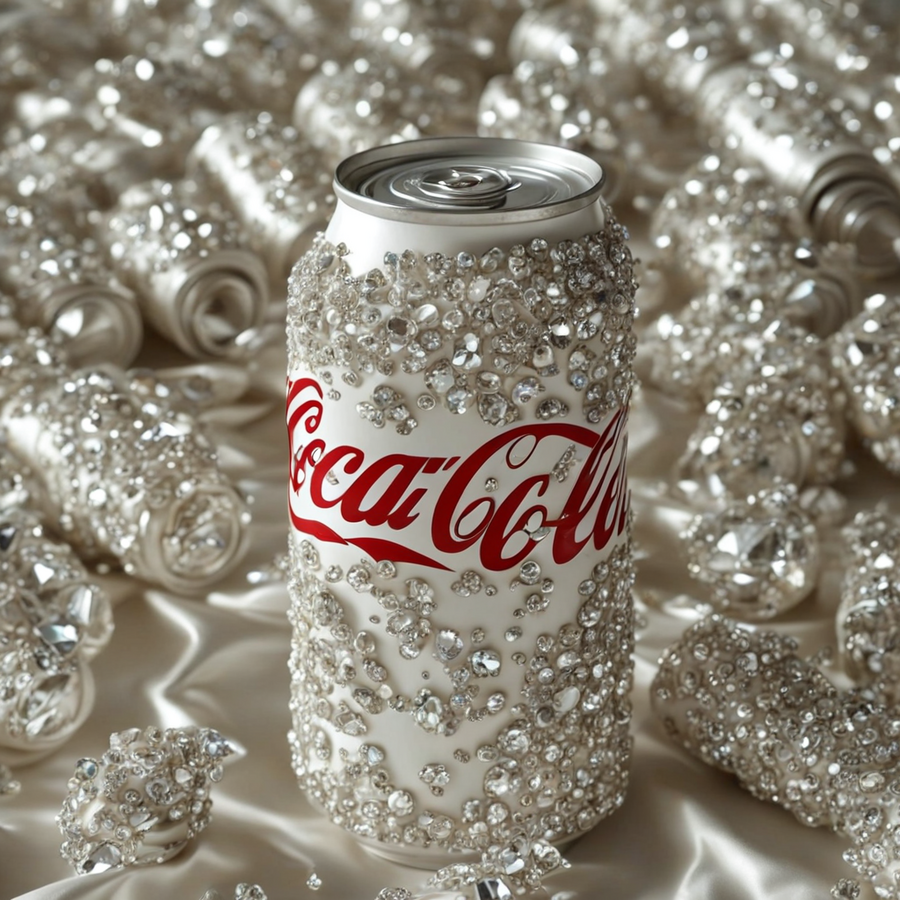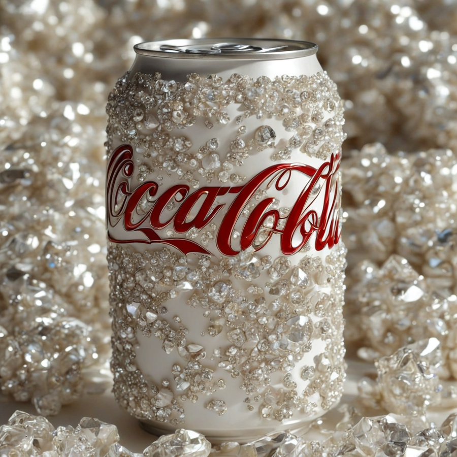 prompt = «photo in CRISTAL style, white tin can of coca cola with many crystals on it»