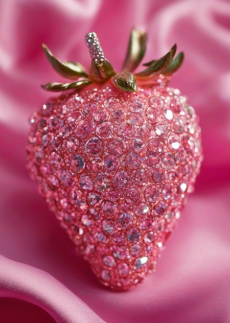 prompt = «photo in CRISTAL style, a jeweled strawberry covered in sparkling pink crystals…»