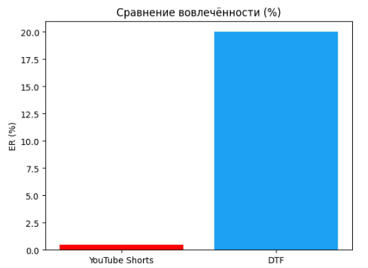Статья на DTF показала высокую вовлеченность (20%) — значит, тема заинтересовала аудиторию, но охват мал (30 просмотров).