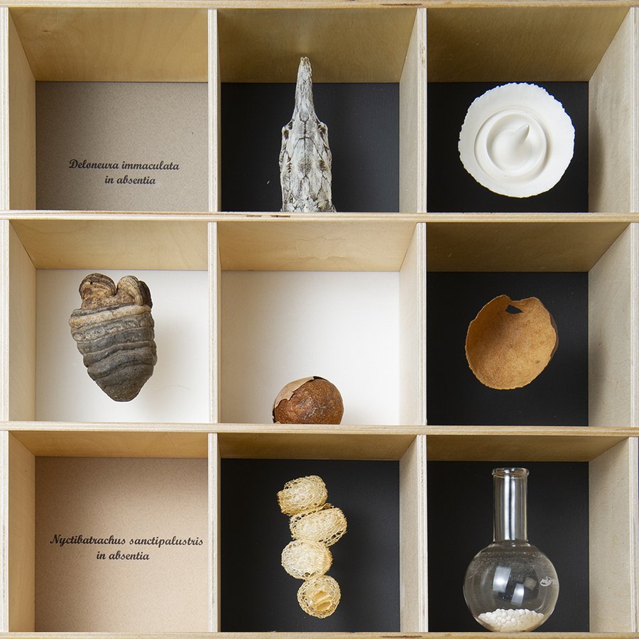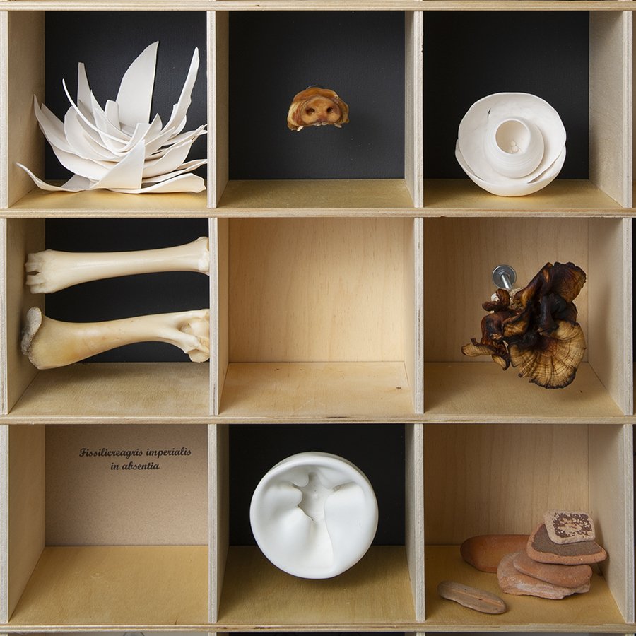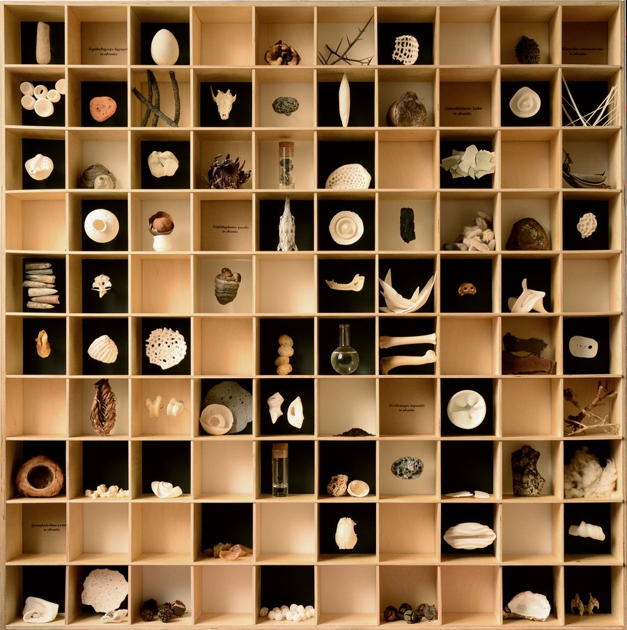 Found by an artist and her friends, bones, seeds, sticks are hard to distinguish from small porcelain things. These artifacts are like the details stored in memory, an illustration of the tradition of collecting rare or strange things that can be seen as the whims of memory, often replacing reality with fantasy.