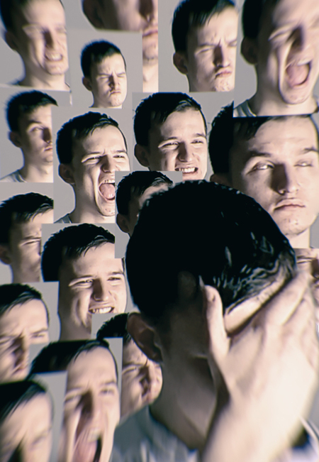 Человек смотрит в камеру. На его лице активно и беспрерывно проявляются несвойственные изменения в мимике, сопровождаемые смешанной звуковой дорожкой, в которой содержится наводящая стресс информация.