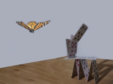 Все эти предметы — одуванчик, бокал, бабочка, карточный домик — объединяет их хрупкость. Они напоминают нам о том, что мир полон красоты и нежности, но в то же время он очень уязвим и требует к себе бережного отношения. Хрупкость этих предметов вызывает у нас чувство сострадания и заботы, а также осознание того, что мы должны беречь и охранять всё прекрасное, что есть в этом мире. Бабочка, несмотря на свою хрупкость, способна разрушить этот мир. Взмахи её крыльев могут разрушить карточный домик, а её лёгкое прикосновение — разбить бокал. Даже семена одуванчика могут быть рассеянны по ветру благодаря движению её крыльев. Это напоминает нам о том, что хрупкость не всегда означает беспомощность. Иногда даже самые нежные существа могут оказать значительное влияние на окружающий мир.