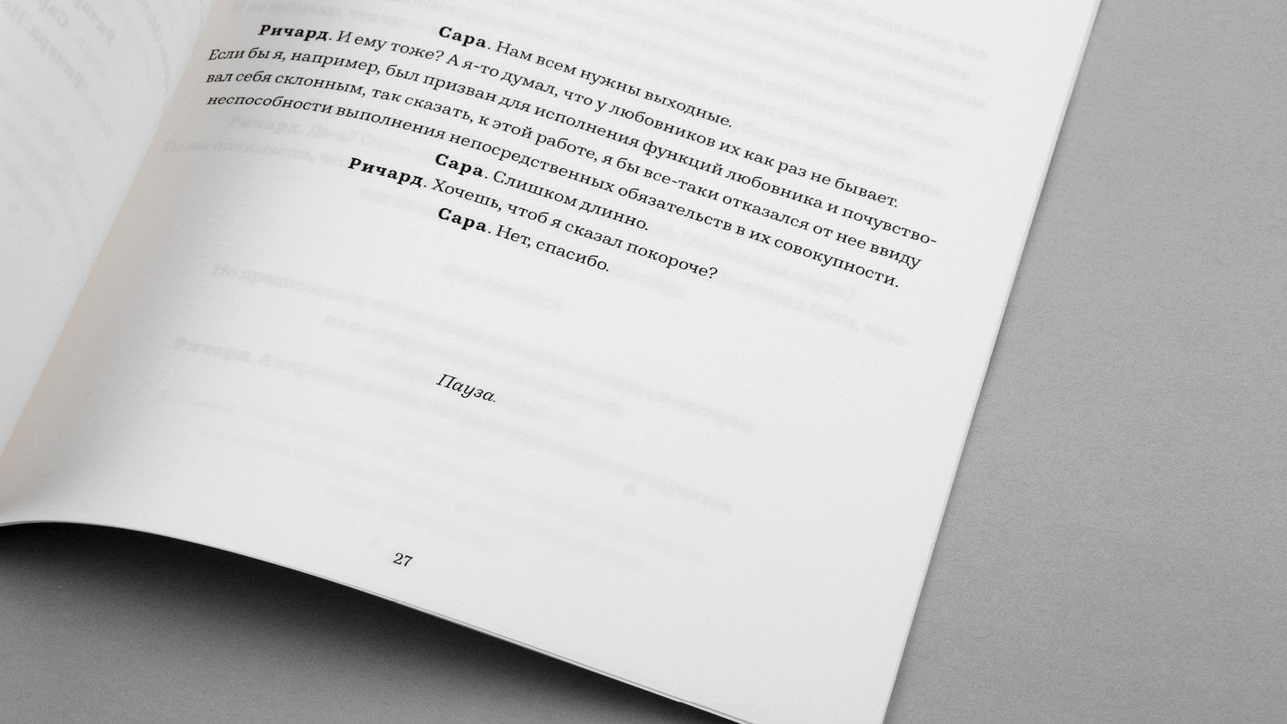 Любовник. Действующие лица внутри основного текста, выделяются жирным начертанием, центральная выключка текста.