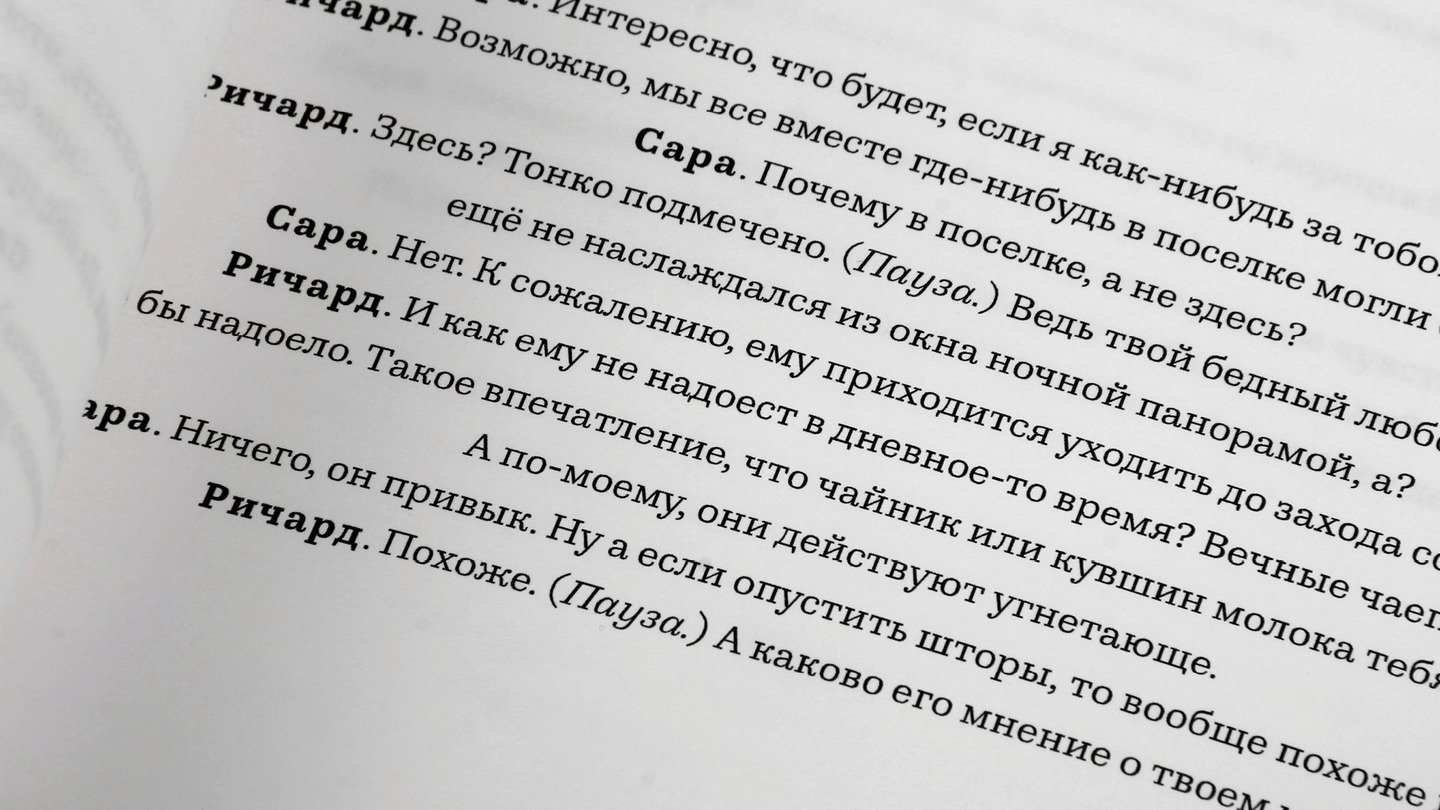 Кухонный лифт. Действующие лица вынесены слева от основного текста капителью, выключка текста по левому краю.