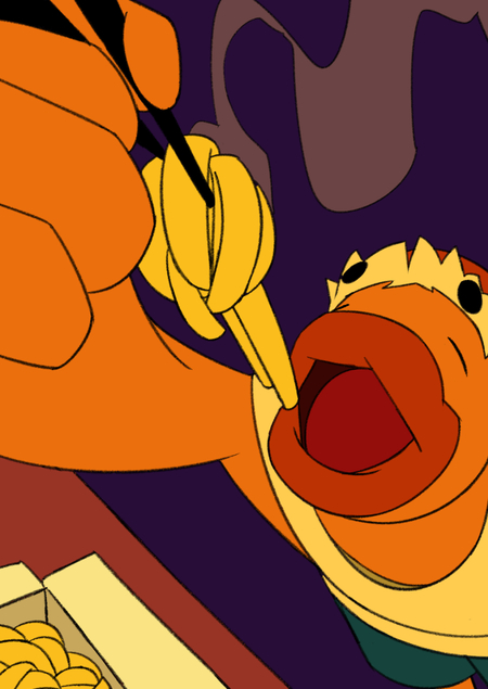 Анимационный диптих, рассказывающий о конфликте между человеком-рыбой и инопланетянином за невероятно вкусную горячую лапшу.