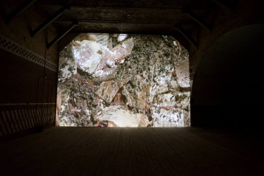 Выбор этой выставки может показаться не совсем однозначным, однако её можно в каком-то смысле отнести к сайт-специфичным проектам. «Вечно живой труп» — проект студентов и выпускников института «База» Анатолия Осмоловского 2014-го года. Однозначно сказать, о чём конкретно эта выставка, довольно сложно: авторы рассуждают и о формализме в искусстве, и о смерти, и о религии. Многие работы объединяет телесное, физическое в человеке и происходящее с этим физическим после смерти. Возможно, само название наталкивает на мысль о консервации, что неминуемо ведёт к ассоциации с историей пространства, сохранении вина, что само по себе концептуально связано со смертью.