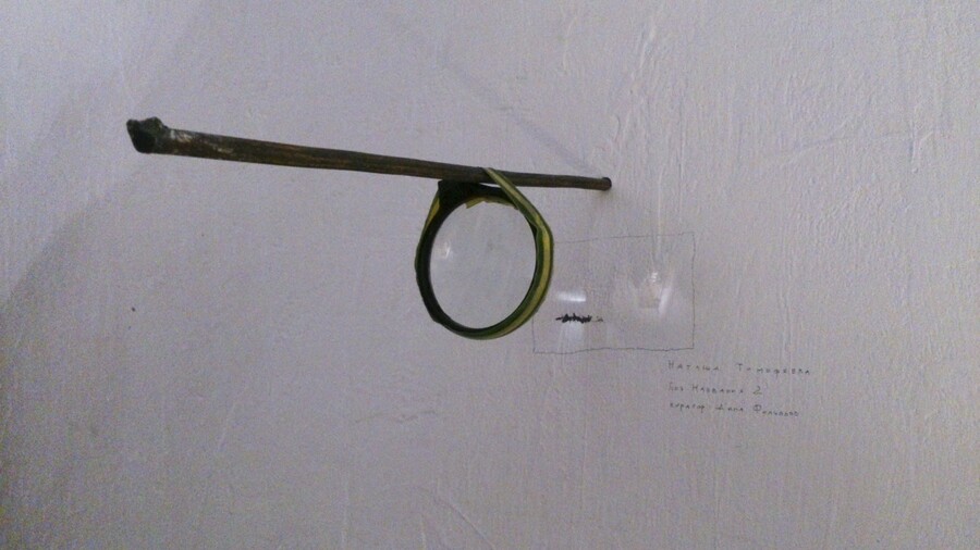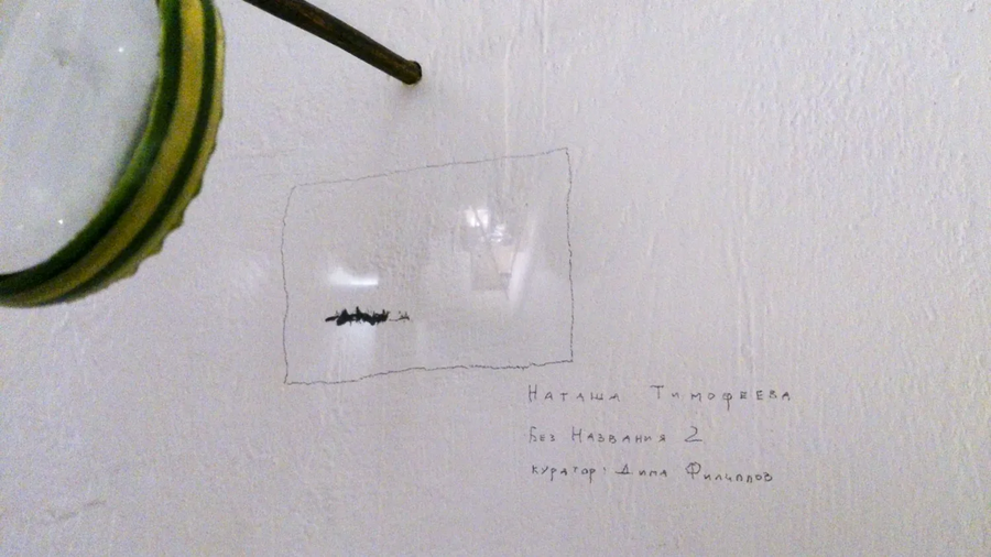 Вторая работа Наташи Тимофеевой, связанная с Электрозаводом, называется в продолжение предыдущей: «Без названия 2». На этот раз художница действует одновременно более масштабно и более минималистично. Экспозиция на первый взгляд выглядит не особенно примечательно, и только при помощи светового оформления зритель догадывается, на что именно нужно обратить внимание. Буквально подсвечиваются детали, которые на первый взгляд незаметны, будь о кусок разбитого стекла одного из окон, или прожжённая часть обивки на диване. Все эти «объекты» — свидетельства истории пространства, превращённого в арт-площадку, на которых и акцентирует внимание художница. Один из центральных — лупа, прикреплённая на расстоянии от стены, при помощи которой на отражающей пластине можно разглядеть происходящее в галерее в тот момент. «Без названия 2», в отличие от своей «предшественницы», теперь прочно связана с пространством Электрозавода, и не может быть экспонирована в другом месте, кроме него.