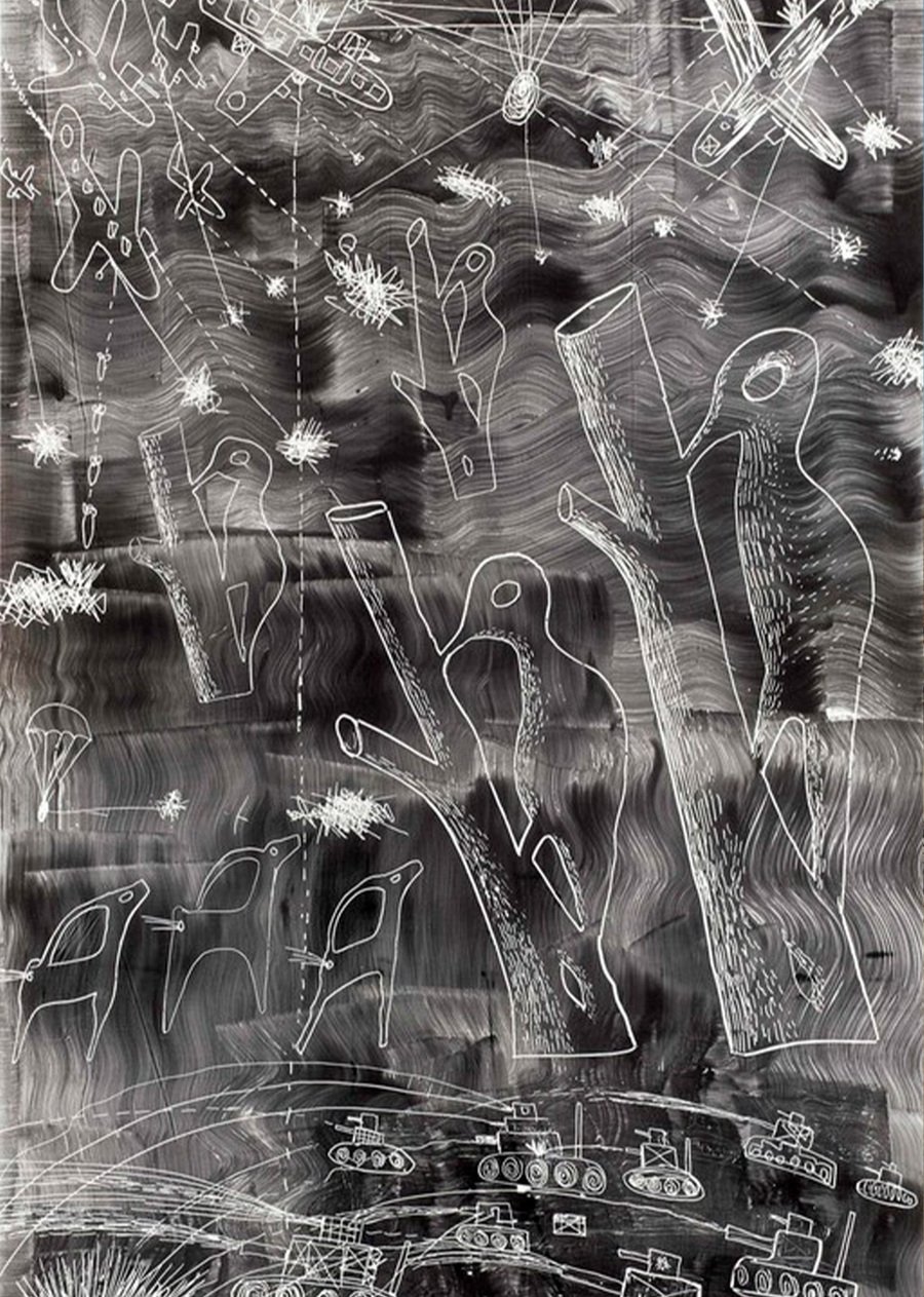 Работа художника Яна Посадского обращается непосредственно к истории завода. «Выйти сухим из воды» вдохновлён эпизодом, когда в 1760 году владелец завода Алексей Турчанинов, перестраивая плотину, использовал труд нелегальных рабочих из Башкирии. Когда с проверкой строительства пришла полиция, Турчанинов дал приказание открыть плотину, и сотню рабочих смыло водой. Художник изображает их углём на стене домика, возведённого над плотиной: постепенно уголь смывается под осадками, и лица людей буквально стираются водой.