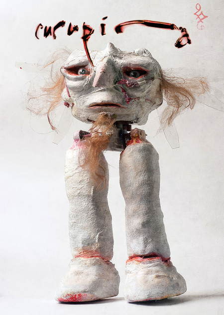 Игрушечный робот, полимерная глина, человеческие волосы, марля, акриловый клей, акрил