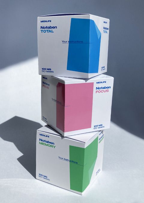 Notaben — добавка для улучшения работы мозга. Концепция дизайна основана на метафоре памяти, отрывном стикере для заметок. Изображение стикера на упаковке выполняет роль места для записи рецепта. В серии представлены таблетки для улучшения памяти, фокуса внимания и общей работы мозга.