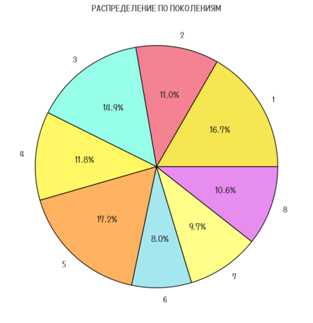 Распределение покемонов по поколениям неравномерно — доля каждого поколения варьируется примерно от 8% до 18%. При этом легендарные покемоны составляют около 9% от общего числа.