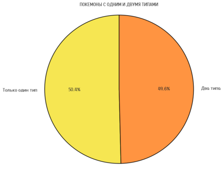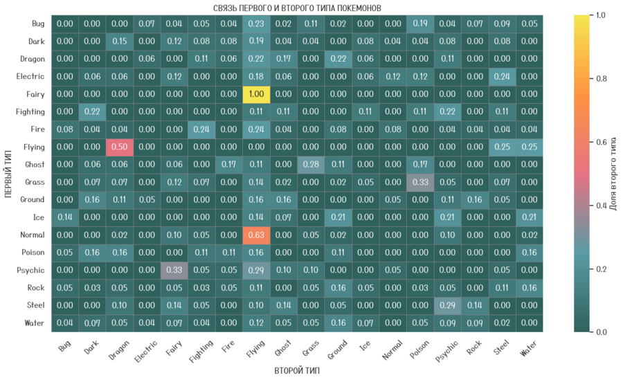 Примерно у половины покемонов присутствует второй тип, и анализ взаимосвязи между первым и вторым типами показал, что некоторые сочетания встречаются значительно чаще других, что отражает особенности биологии и баланса покемонов.
