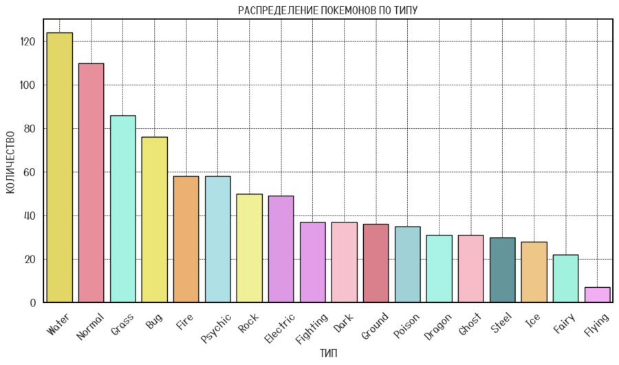Наиболее распространёнными типами покемонов оказались Водяной, Нормальный, Травяной, Жук и Огненный — вероятно, из-за их разнообразия и важности в игровых механиках.