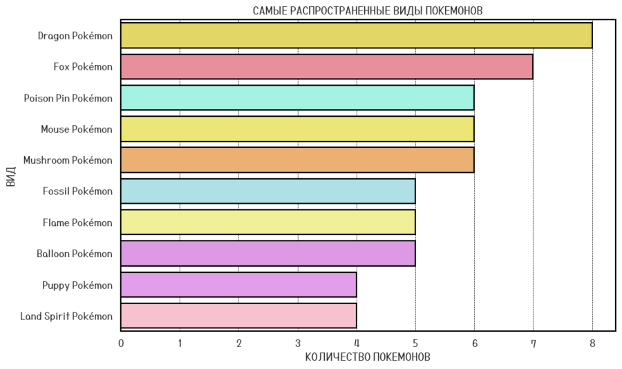 Среди видов покемонов самыми распространёнными являются Dragon, Fox, Poison Pin, Mouse и Mushroom, что может указывать на популярность и узнаваемость этих категорий.