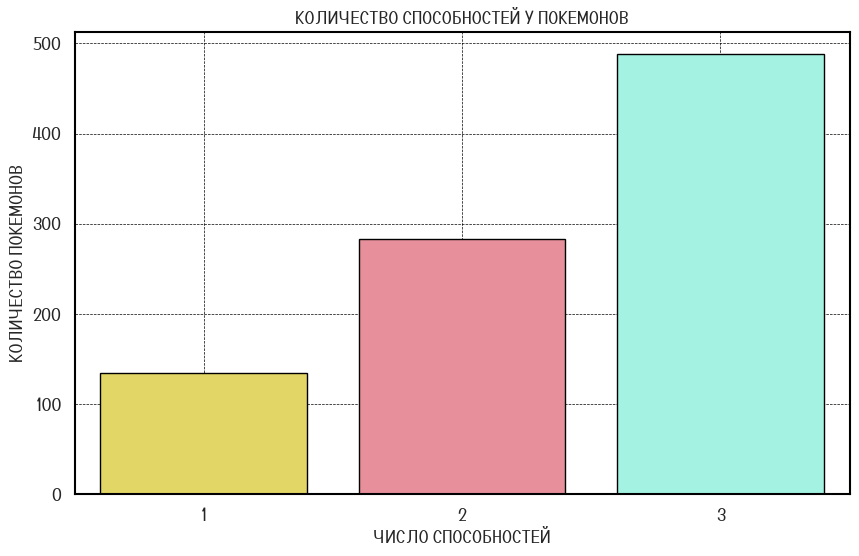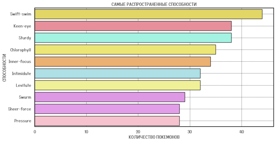 Большинство покемонов обладают тремя способностями, причём наиболее часто встречаются такие способности, как Swift-swim, Keen-eye и Sturdy.