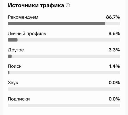 Алгоритмы TikTok уже дали «Лифту» шанс: 86% трафика из рекомендаций, что вполне неплохой результат. Главный стоп-фактор — низкий досмотр и удержание внимания зрителя <10%, что тормозит дальнейшее распространение.