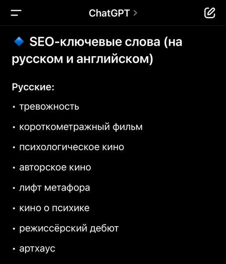 Заодно я попросила ИИ составить список ключевых слов для SEO на русском и английском. Таким образом я получила не только текст, но и его базовую SEO-оптимизацию для размещения на площадке.