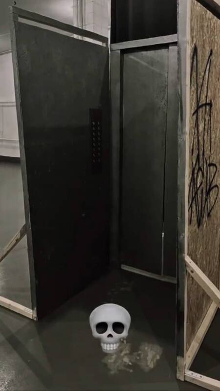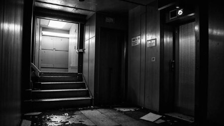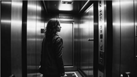 «claustrophobic elevator, black and white, film-grain texture, poster-style, 3:4»