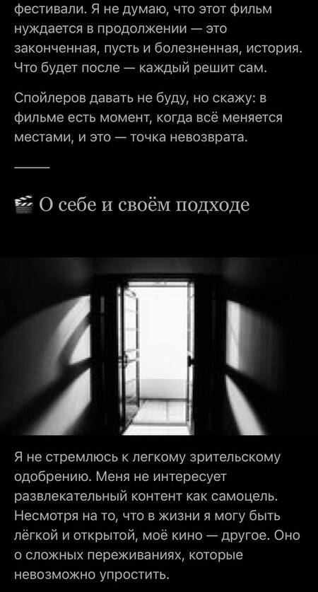 Пожалуйста, задай ей 12–15 вопросов, которые помогут: — раскрыть тему фильма с художественной и личной стороны; — понять, зачем она его сняла и какую мысль хотела донести; — поговорить о процессе: от идеи до съёмок и продакшна; — понять, как фильм связан с её личным опытом и состоянием; — затронуть тему женского высказывания, психики и кинопамяти; — вывести на мысль, как она чувствует себя как режиссёр; — закончить интервью вопросами про будущие проекты и рост.
