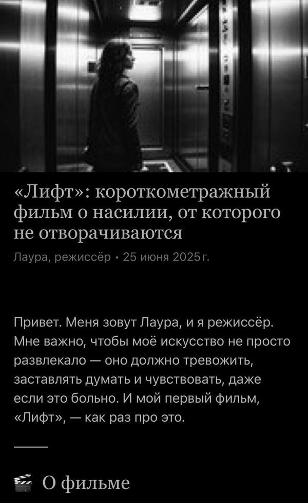 В рамках продвижения авторского короткометражного фильма «Лифт», который я снимаю в рамках курсового проекта НИУ ВШЭ, я провела серию экспериментов по размещению контента на разных цифровых платформах. Целью стало не только распространение информации о проекте, но и изучение поведения аудитории: какие форматы вызывают отклик, как алгоритмы работают с «неудобной» темой, и насколько эффективно инструменты искусственного интеллекта могут помочь в этом вопросе.