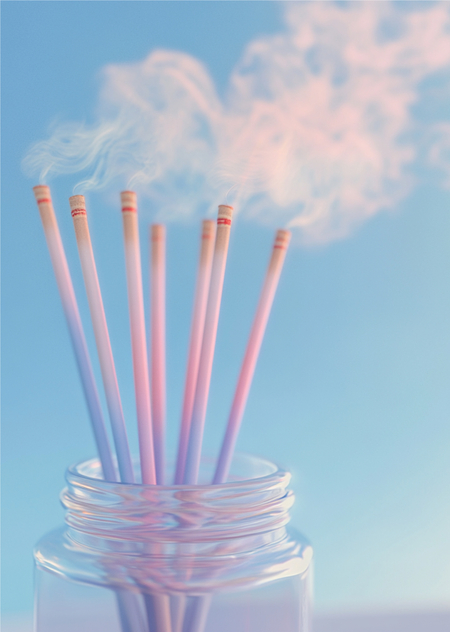 Realistic photostyle realistic image of light pink and blue incense sticks placed on blue sky background, with a jar of incense nearby. The incense emits a, calming smoke, creating a serene atmospher