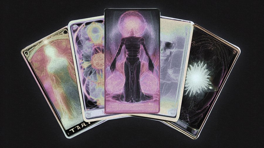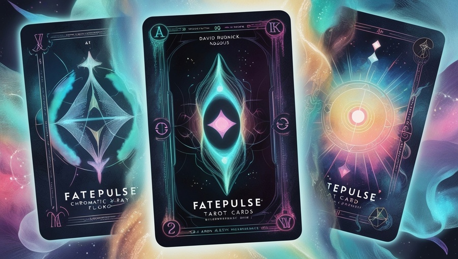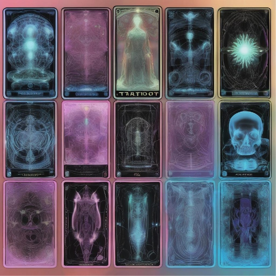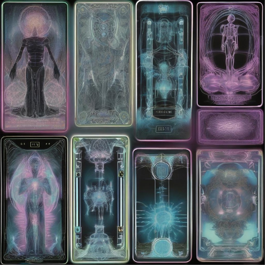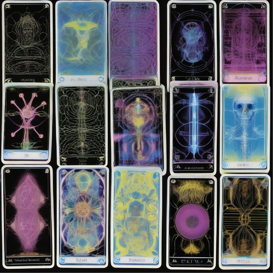 Промпт: Electronic tarot cards from the FatePulse brand. Style: simple chromatic xray, flooko, 2002, purity, soft bioluminescent membranes, aeron alfrey, in 2 0 0 2, lossless, david rudnick, noxious. Add magical colors.