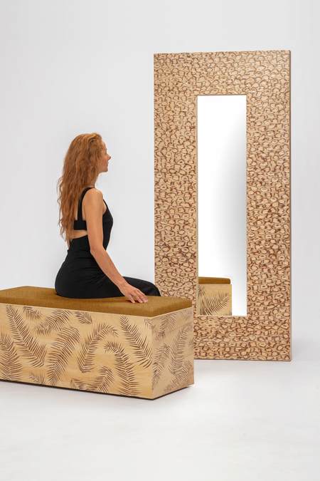 Feel yourself in the arms of nature, being at home. A collection of wooden facade textures, reflecting the most closest motifs of Primorskiy region. A floor mirror, a bedside bench and a pouf are presented as an illustration of their application.
