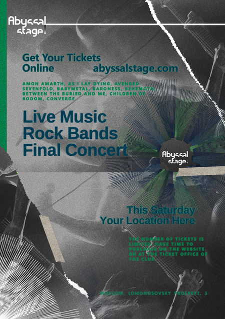 Промо 2 промт Создать реалистичное изображение плаката, посвящённому финальному концерту рок-групп, прикреплён на старую потрёпанную стену с граффити и остатками других афиш. На плакате крупные надписи: «Live Music Rock Bands Final Concert», а также информация о мероприятии, названия групп, такие как Amon Amarth, As I Lay Dying, Avenged Sevenfold, Baroness, Behemoth. А также логотип «Abyssal Stage»: в центре изображения размещен круг черного цвета, внутри которого стилизованные концентрические линии формируют текстуру, переходящую от темно-синего к зеленому, создавая эффект глубины и движения. В центре круга расположена белая надпись «Abyssal stage. с гладким футуристическим шрифтом. Дизайн плаката выполнен в тёмных тонах с элементами текстур и разрывов, что создаёт атмосферу андеграундной эстетики. Фон стены с облупившейся штукатуркой, яркими тегами и наложенными слоями старых афиш подчёркивает уличный стиль и необработанный городской характер. Стиль изображения фотореалистичный, с вниманием к деталям и светотени.