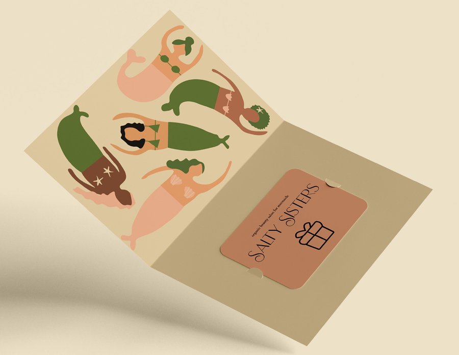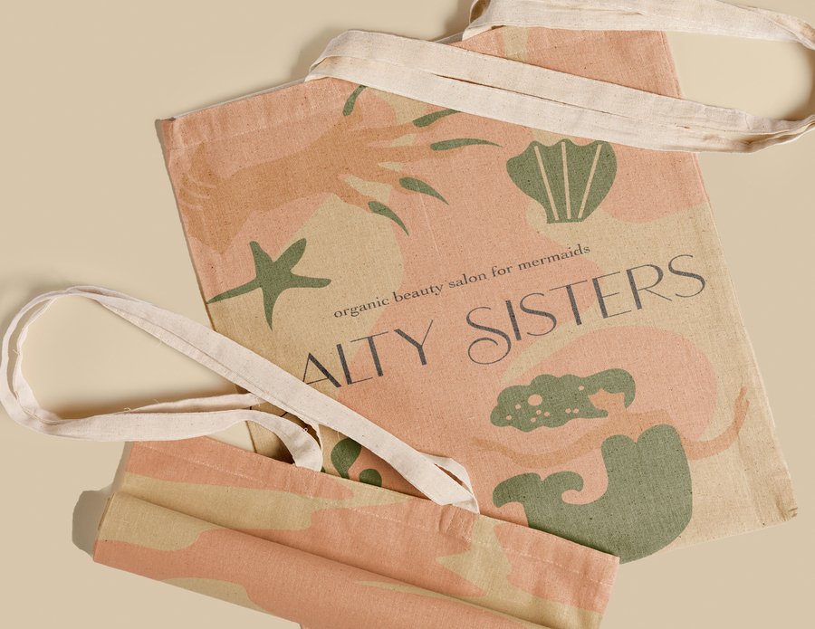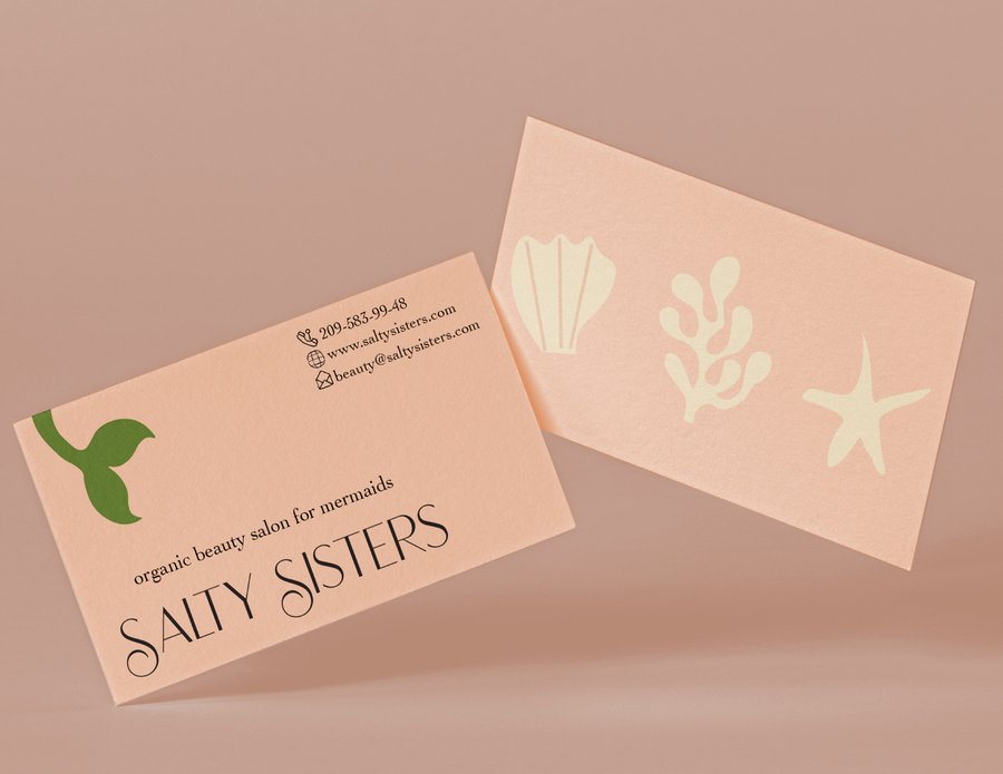 An enchanting beauty salon named «Salty Sisters» inspired by an underwater world. The color palette consists of various shades of green and blue, reflecting the ocean and marine life. The typography features a custom font with elegant swirls and curls, evoking the image of mermaids and sea creatures. The overall design exudes a magical and peaceful atmosphere, perfect for customers to relax and unwind., typography