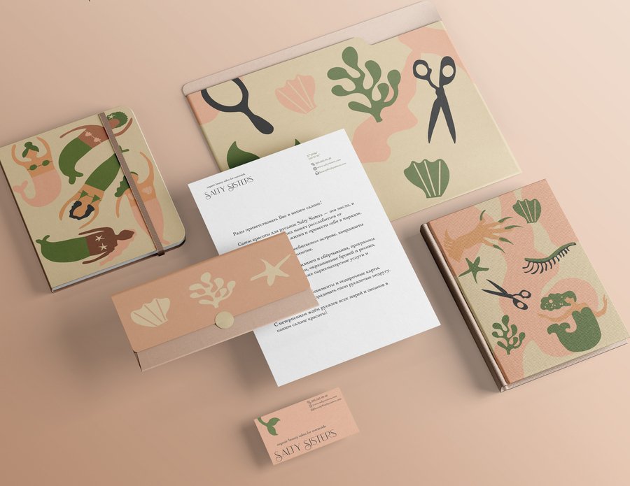 A stunning cinematic poster for the «Salty Sisters» beauty salon. The design features a branded notebook, pen, and envelope with playful, retro typography. The main focus is a glamorous hairstyle, showcasing the salon’s expertise. A beach theme is evident with the use of seashells and sand, creating a coastal, relaxed atmosphere. The overall ambiance is vibrant and cheerful, with a touch of vintage charm, inviting customers to experience the salon’s unique offerings., cinematic, photo, poster, typography