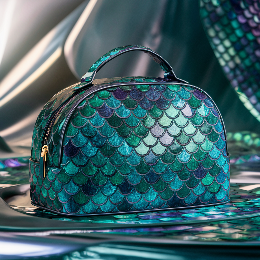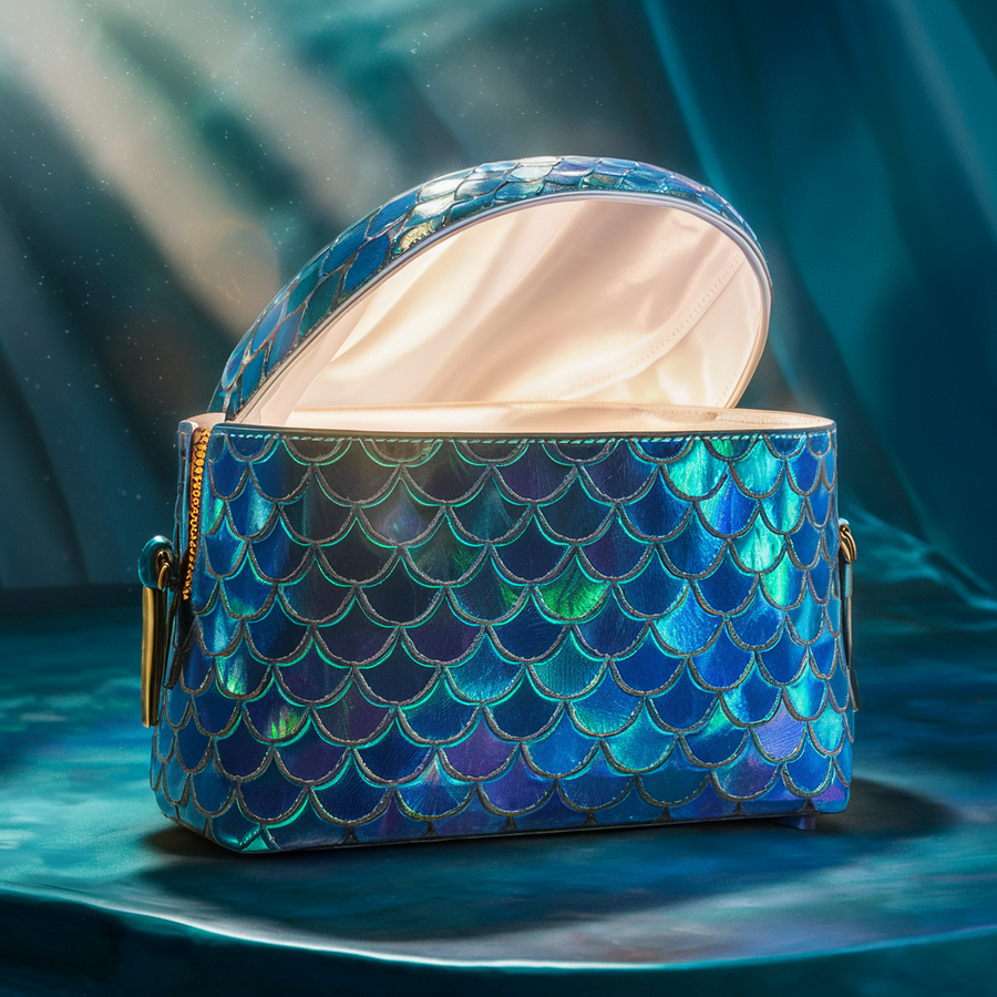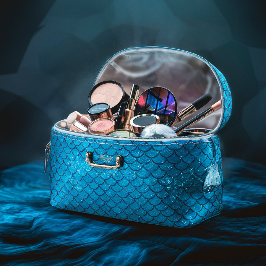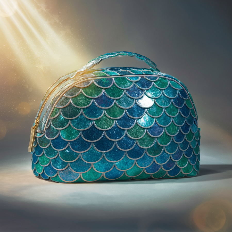 A stunning 3D render of a cosmetic bag featuring a mermaid scale texture. The bag is shown open, revealing a variety of makeup and beauty products. The background is a dark blue, creating a cinematic atmosphere. The mermaid scales on the bag glisten under the soft, ethereal light, giving it a magical and luxurious feel., 3d render, product, cinematic, photo