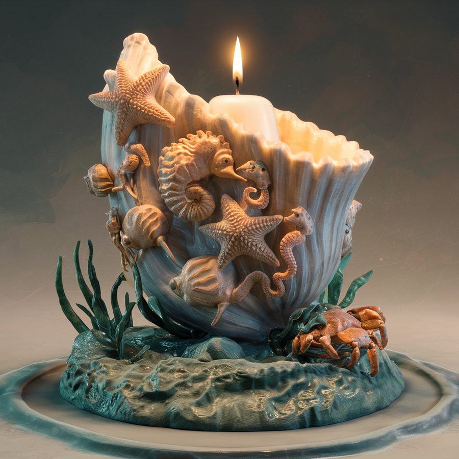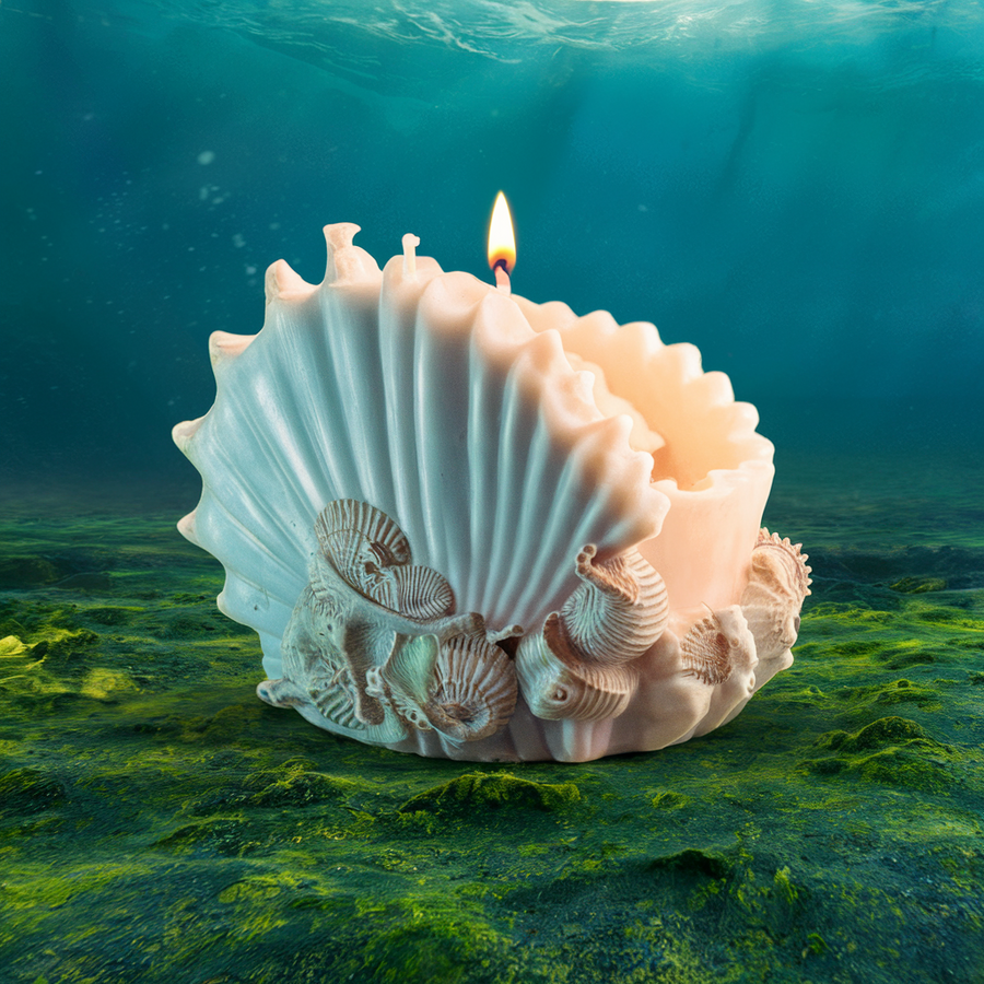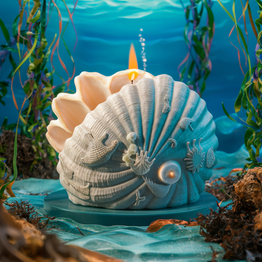 A captivating 3D render of a unique, intricately designed candle. The candle is shaped like a seashell, with various sea creatures etched into it. The candle is surrounded by a realistic underwater scene, complete with swaying seaweed and a serene blue ocean. The candle emits a pleasant, oceanic aroma of sea and algae. The overall ambiance of the cinematic image is tranquil and immersive, transporting the viewer to a peaceful underwater world., cinematic, 3d render