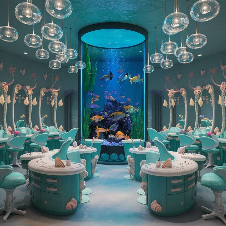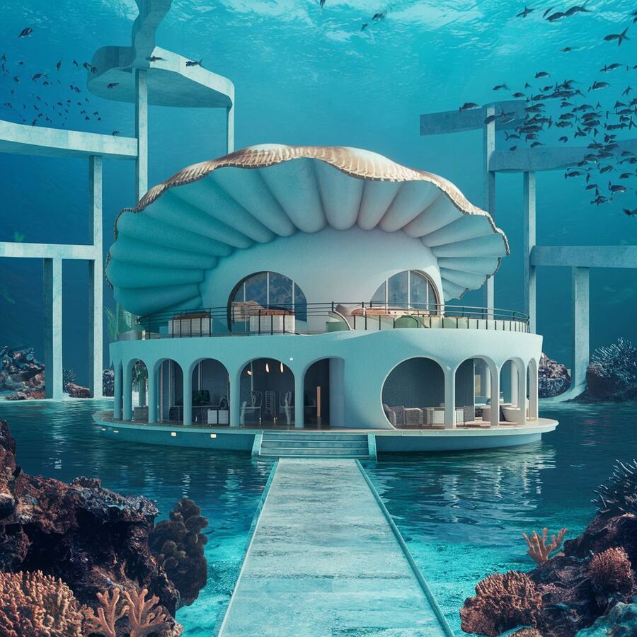 A stunning 3D render of a unique beauty salon building, shaped like a round seashell, situated in the middle of the ocean. The building has several underwater corridors that connect to various sections, each with a different theme. The overall atmosphere of the image is cinematic and captivating, with a blend of futuristic architecture and underwater elements., photo, architecture, 3d render