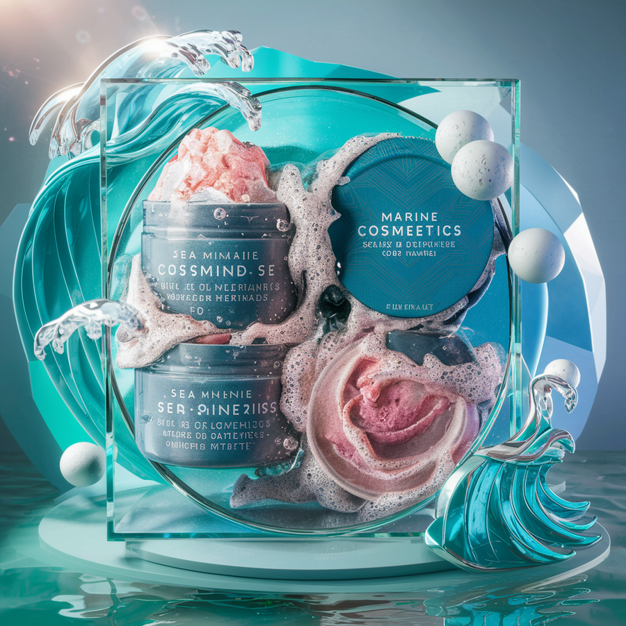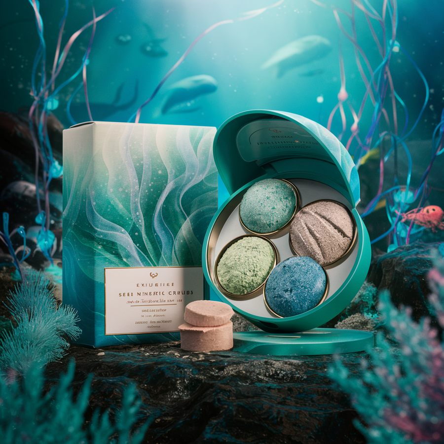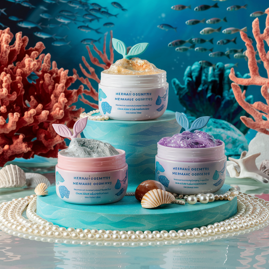 A stunning cinematic photorealistic rendering of a collection of marine cosmetics. The product line includes exfoliating sea mineral scrubs, with each container featuring a playful mermaid design. The scrubs are displayed on a sea-themed platform, surrounded by pearls and seashells. The background showcases an underwater world with vibrant coral and schools of fish swimming in the distance. The overall ambiance is enchanting and inviting, perfect for those who dream of a mermaid-inspired beauty experience., photo, product, 3d render, cinematic