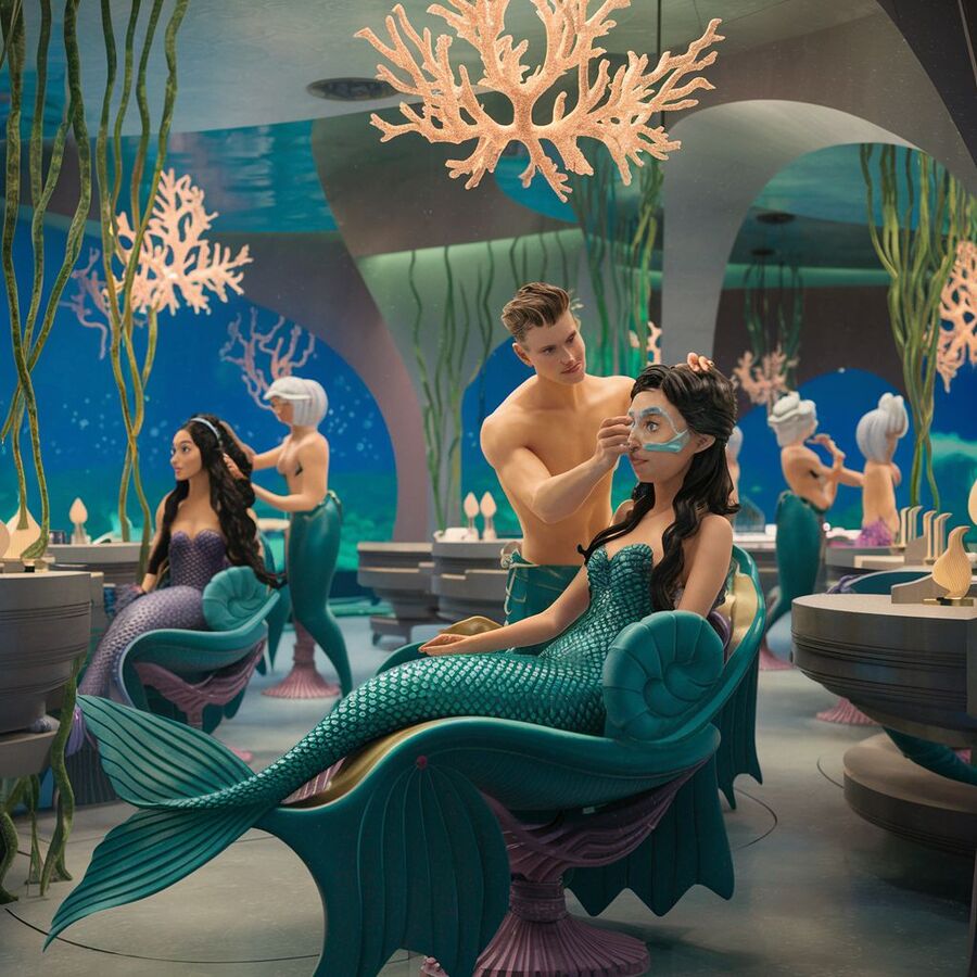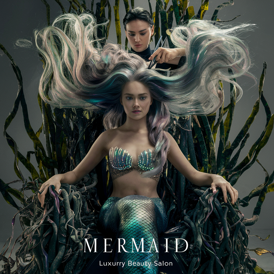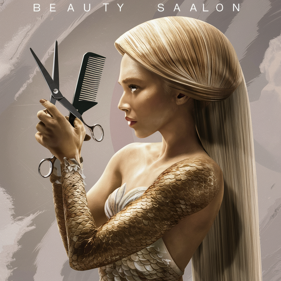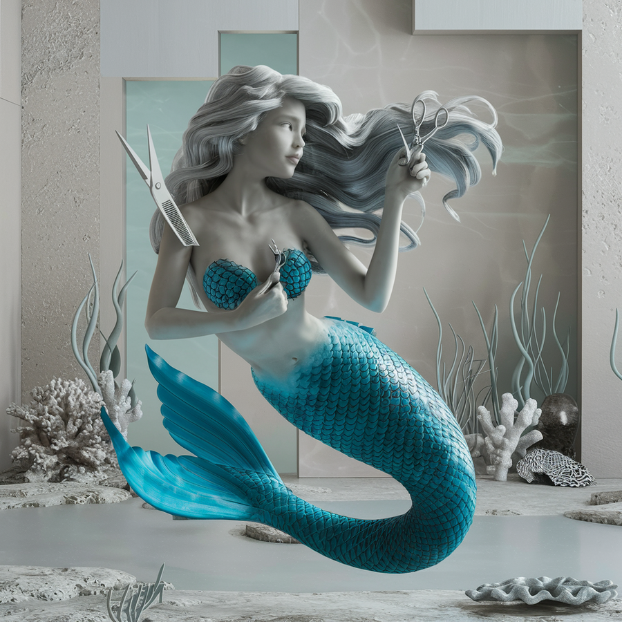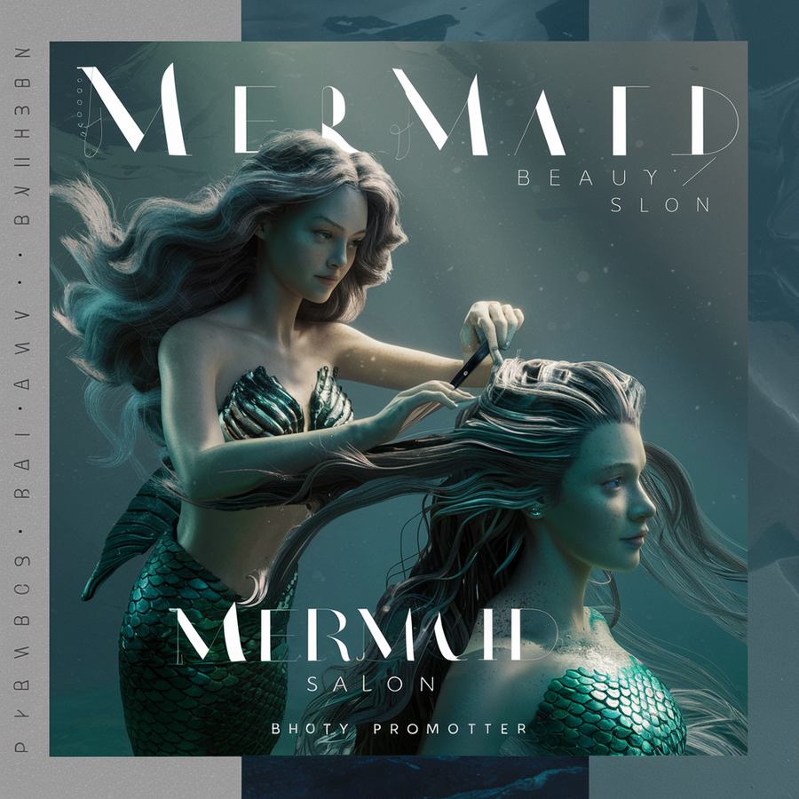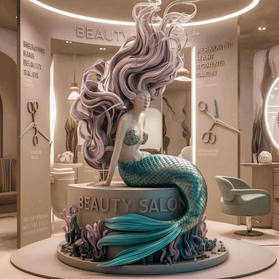 A captivating 3D render of a beauty salon promotional poster featuring a mermaid. The mermaid, with her iconic flowing hair, is seated on a throne surrounded by neutral-colored elements, including a comb and a pair of scissors. The overall atmosphere is cinematic and glamorous, with a touch of magical realism, making the viewer feel like they’ve stepped into an underwater wonderland., 3d render, poster, cinematic