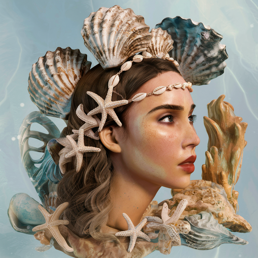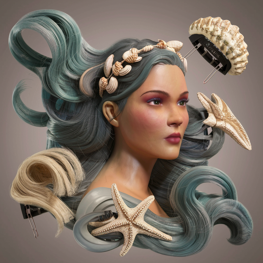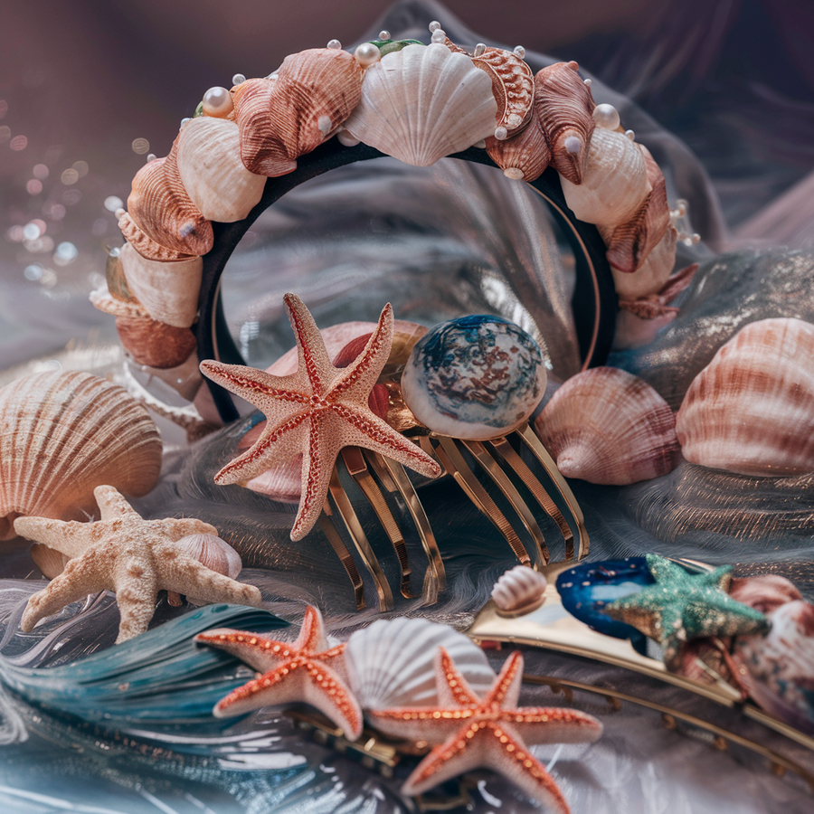 A stunning 3D render of a cinematic photo featuring a variety of sea-inspired hair accessories. A model is shown wearing a headband adorned with large, intricate shells, while her hair is styled with multiple hair clips featuring delicate starfish. The overall aesthetic is a blend of marine and bohemian styles, with a touch of vintage flair. The background is a soft, dreamy blue, evoking the feeling of being underwater., cinematic, product, photo, 3d render