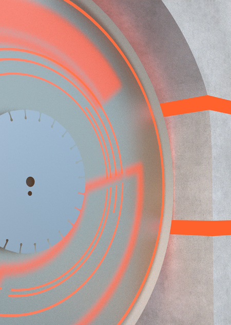 Таким образом, оранжевый свет, проходя через оргстекло, подсвечивает край круга, а также углубления, что создаёт образ нового и инновационного.