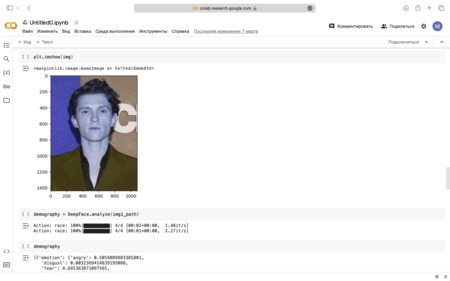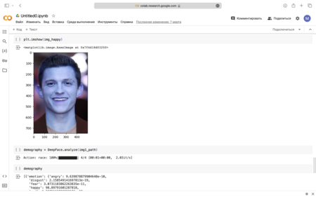 Я установила нейронную сеть, которая используя камеру моего ноутбука, обрабатывает изображения, затем анализирует мимические единицы и сопоставляет их с шаблоном эмоции.