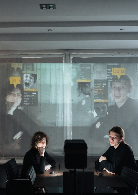 Сотрудники многих компаний сталкиваются c надзорными механизмами каждый рабочий день. Ноутбук на столе напоминает присутствие третьего лица, которое протоколирует происходящее. Мультимейдийный перформанс «Опера на двоих» — считывание выражений лиц перформеров с помощью технологии распознавания и анализа их эмоций. В то время, как приватность человека нарушается, и он становится прозрачным, понятным и уязвимым, видеоаналитика и сервисы облачного хранения видеонаблюдения остаются спрятанными за технологической оболочкой.