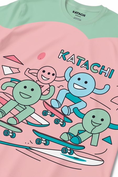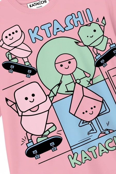 Итоговый промпт: Create a graphic design for a t-shirt featuring characters made from simple geometric shapes—circles, squares, and triangles—riding skateboards. Use a color palette of light pink, light green, and light blue for the characters. The design should depict the characters in dynamic, playful poses that capture the excitement of skateboarding. Incorporate a fun, bold layout that makes the characters the focal point of the shirt. Include the brand name 'Katachi' in a stylish, modern font that complements the overall playful aesthetic.