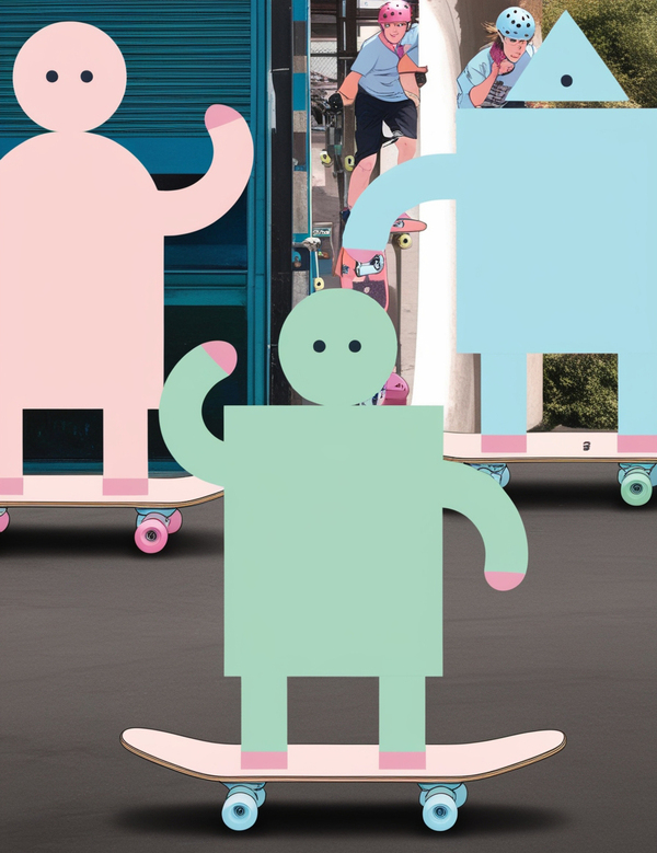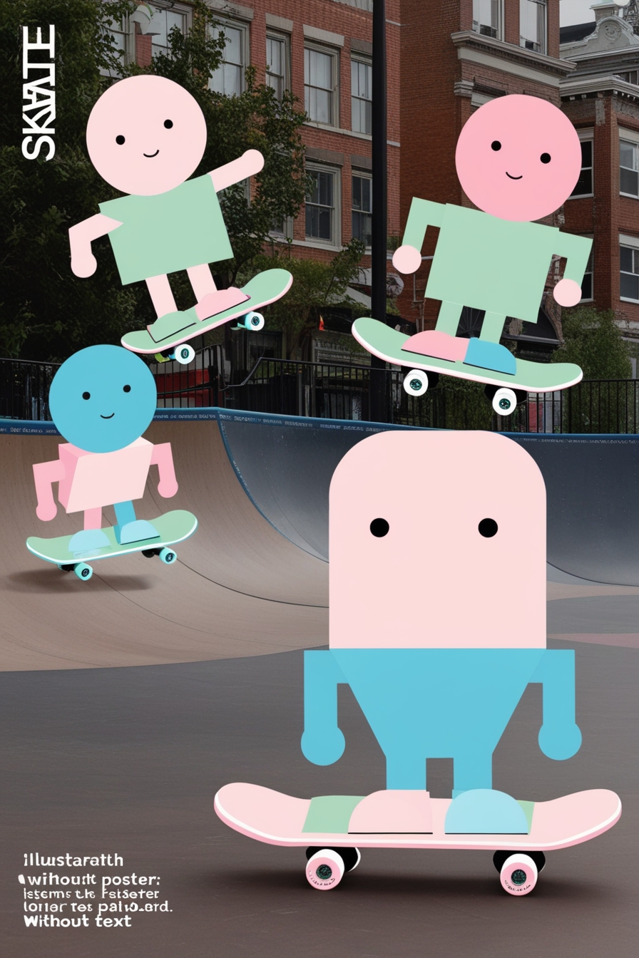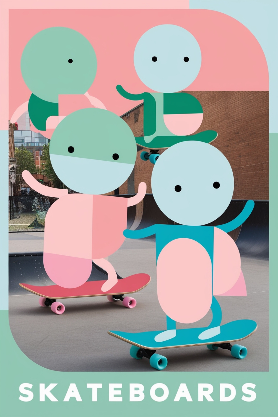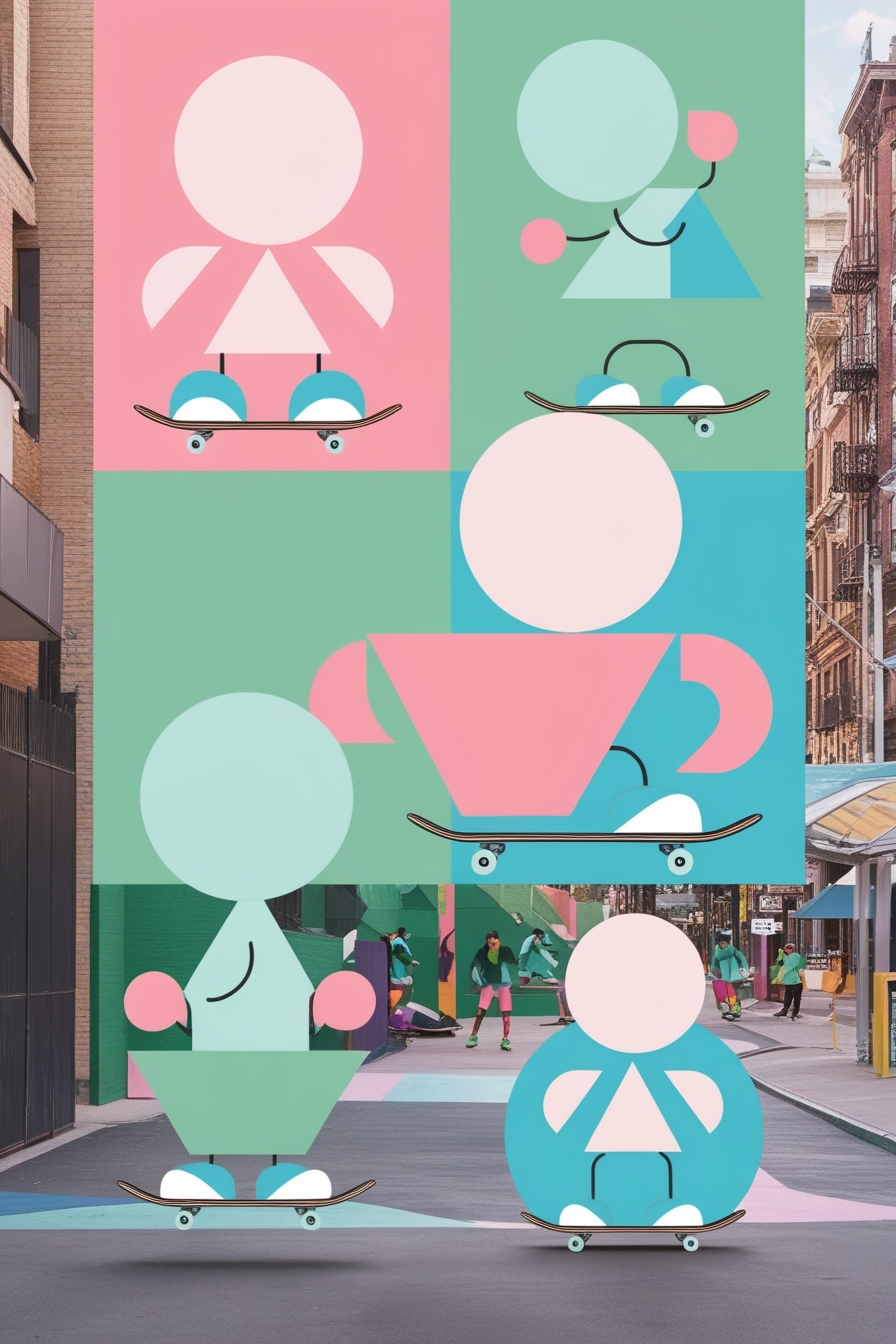 Итоговый промпт: Create an illustration for a poster featuring characters made from simple geometric shapes—circles, squares, and triangles—riding skateboards. Use a color palette limited to light pink, light green, and light blue for the characters. These playful figures should be integrated into a photographic background of a real-world environment, such as a city street or a skate park. The vibrant pastel colors of the geometric shapes should contrast with the detailed, realistic setting, capturing the fun and energy of skateboarding.