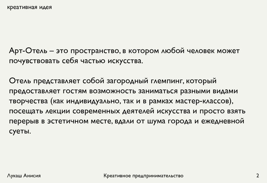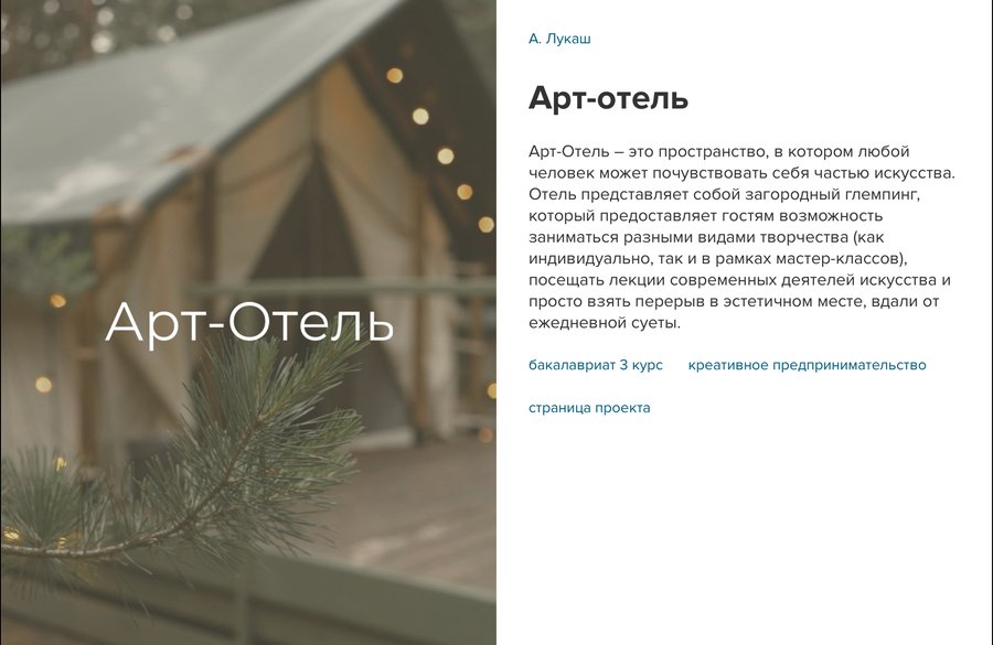 Арт-Отель — это пространство, в котором любой человек может почувствовать себя частью искусства. Отель представляет собой загородный глемпинг, который предоставляет гостям возможность заниматься разными видами творчества (как индивидуально, так и в рамках мастер-классов), посещать лекции современных деятелей искусства и просто взять перерыв в эстетичном месте, вдали от ежедневной суеты.